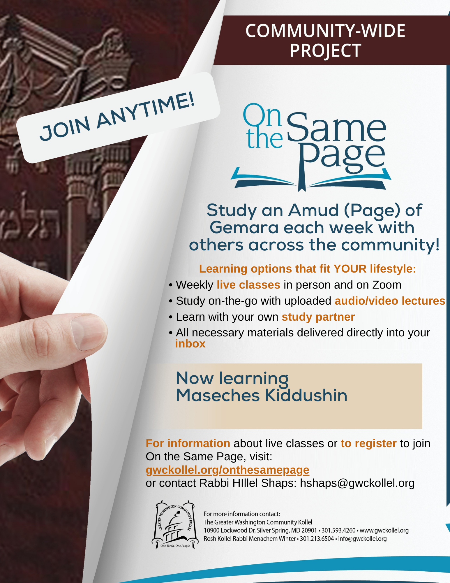 On the Same Page: Study an Amud (page) of Gemara each week with others across the community. Learning options that fit YOUR lifestyle. Now learning Maseches Kiddushin. Click HERE to learn more.