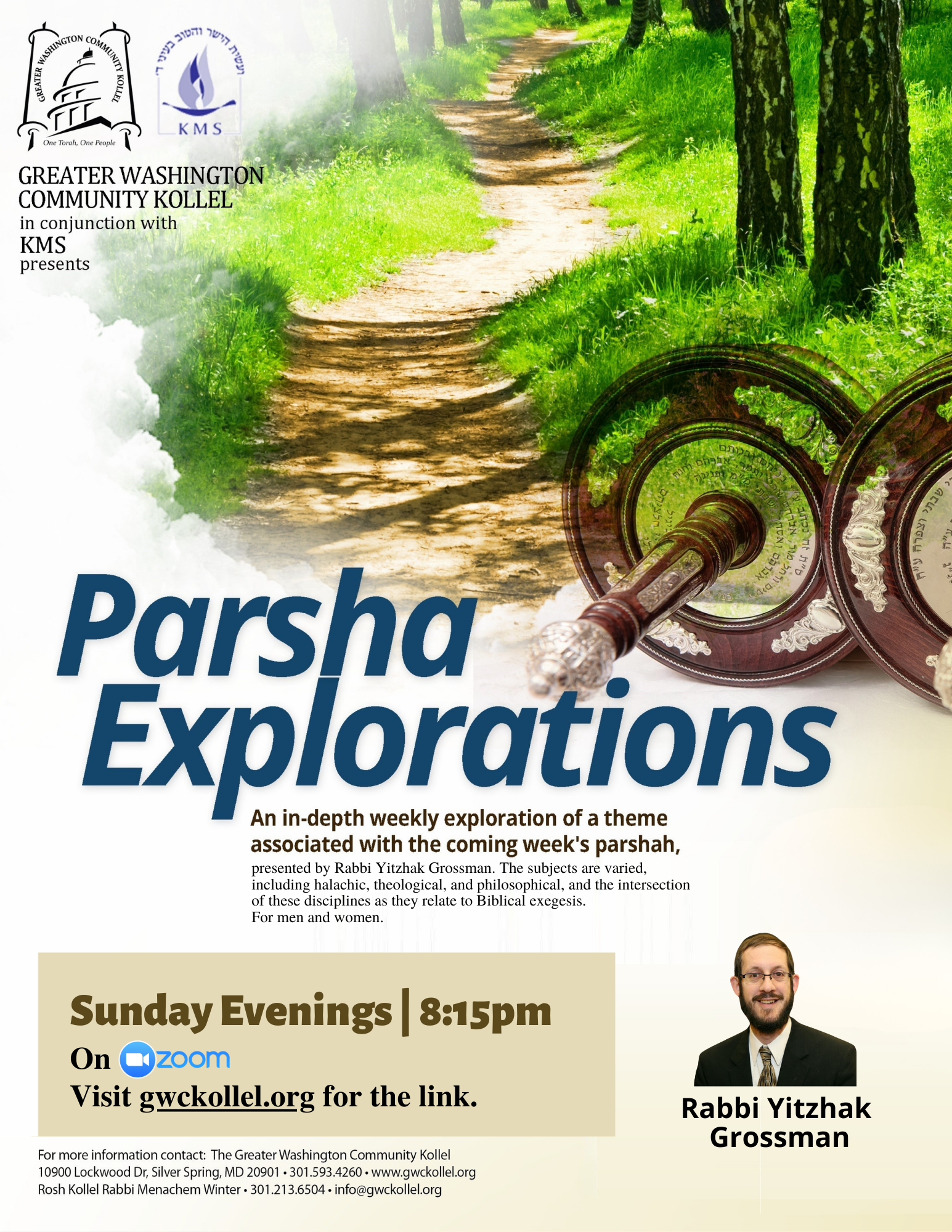 Join Rabbi Grossman for an in-depth weekly exploration of a theme associated with the upcoming week's parashah. The subjects are varied, including halachic, theological, and philosophical, and the intersection of these disciplines as they relate to Biblical exegesis. The Zoom link can be found on the homepage.